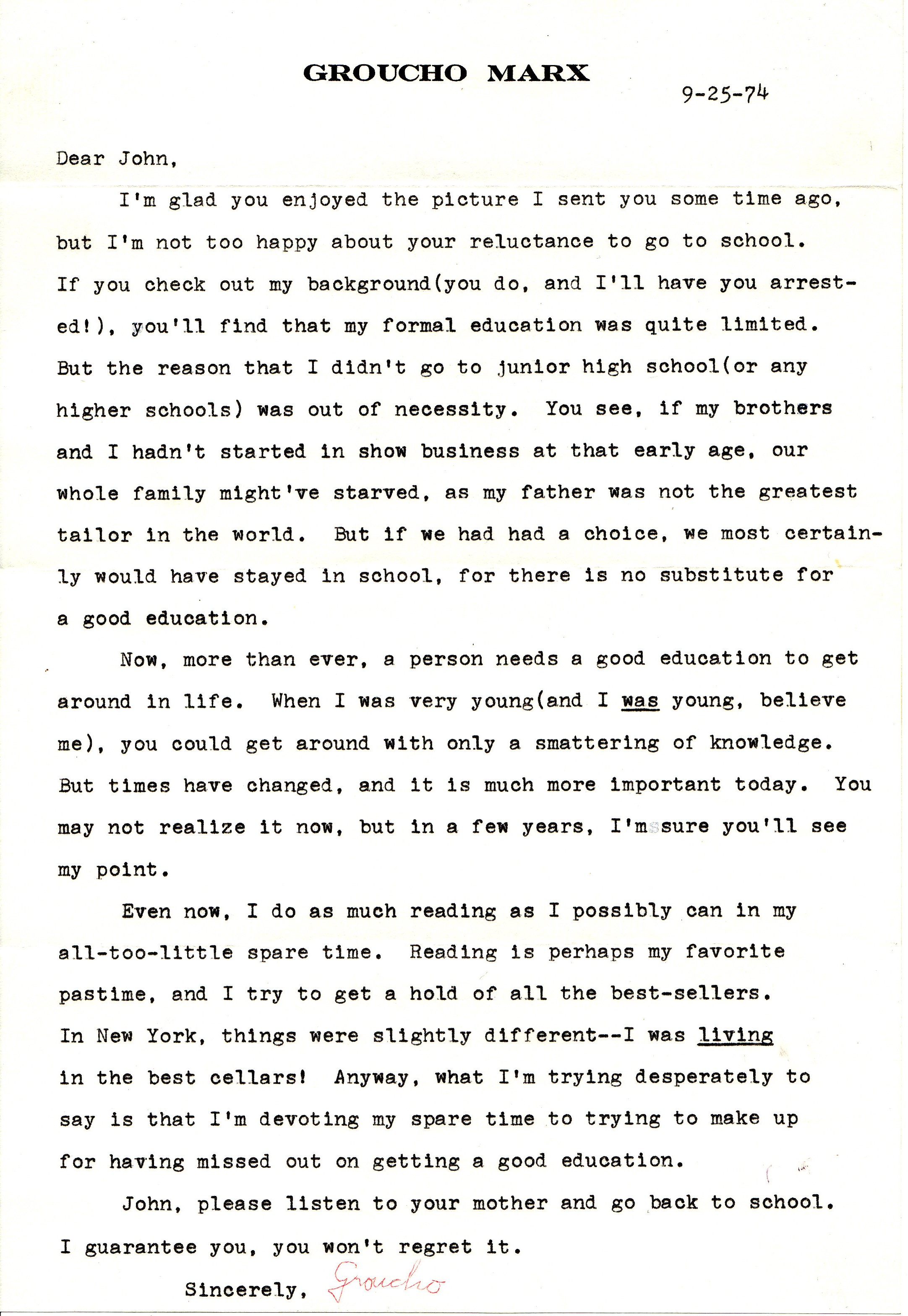 It wasn’t just a thank you note, of course.  I thought of Groucho as my friend (sort of), so I told him a little about me, where I lived–that kind of thing.  I also told him that I had read about how he dropped out of school and that I thought that was very cool.   This was my plan, too.  I told him that I refuse to go to school and that it was obvious that one could be very successful without it.